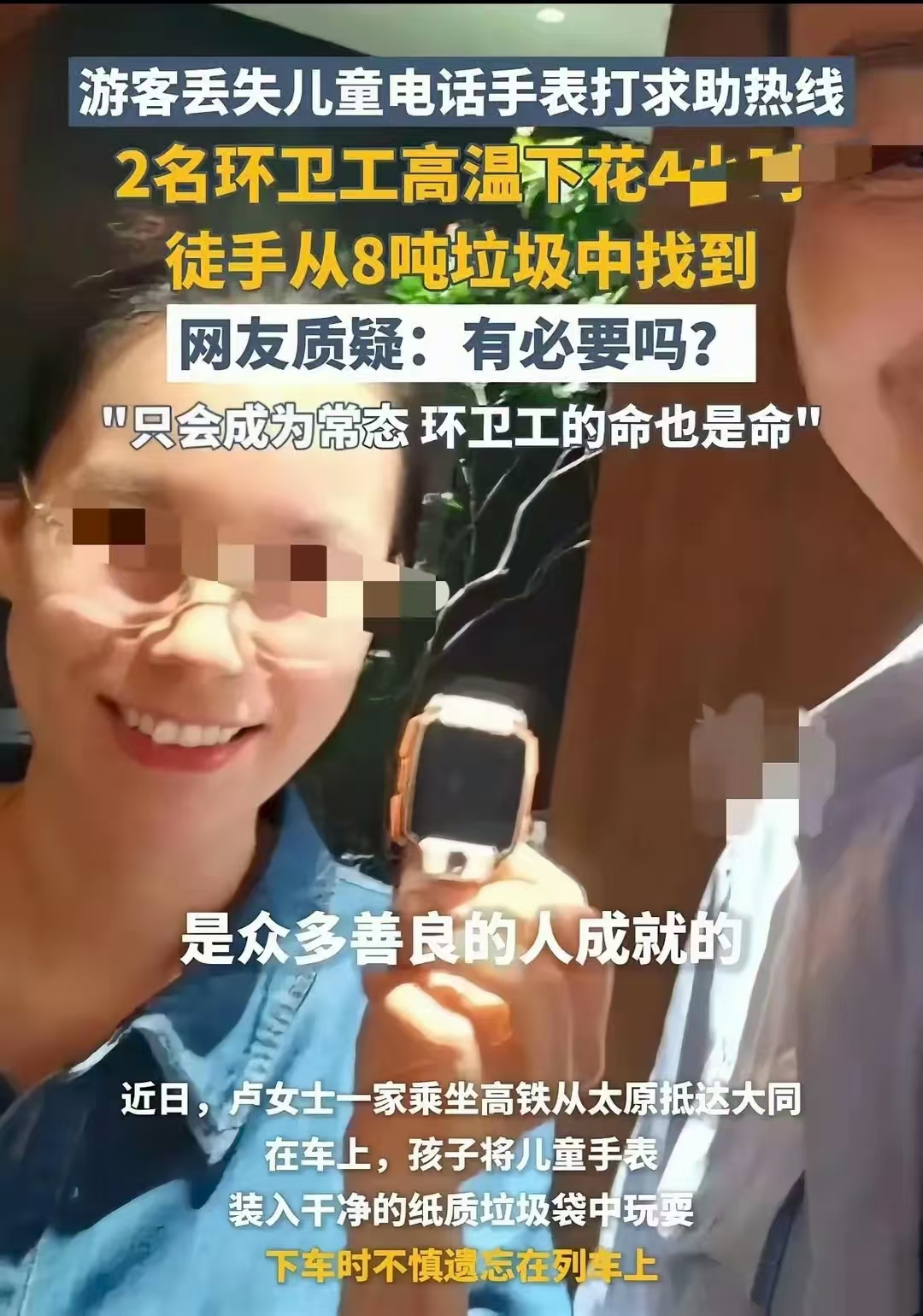 事件始于2025年7月1日。來自深圳的盧女士一家乘坐高鐵從太原抵達(dá)大同時(shí),孩子不慎將兒童手表裝入干凈的紙質(zhì)垃圾袋中玩耍,