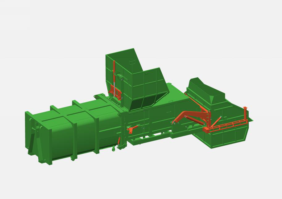 主機箱體包含:主機箱體、壓縮倉、壓頭、壓縮油缸、滑輪、液壓系統(tǒng)、電控系統(tǒng)等組成。其主要結(jié)構(gòu)件采用Q345高強度結(jié)構(gòu)鋼焊接成成,具有較有的耐磨性;主機箱體上的滑輪與滑臺導軌配合,使主機能相對滑臺滑動,液壓電控系統(tǒng)固定安裝于主機箱體上,整體簡潔美觀。箱體容積15m3,匹配16噸后雙橋車廂可卸式垃圾車。