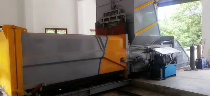 主機箱體包含:主機箱體、壓縮倉、壓頭、壓縮油缸、滑輪、液壓系統(tǒng)、電控系統(tǒng)等組成。其主要結(jié)構(gòu)件采用Q345高強度結(jié)構(gòu)鋼焊接成成,具有較有的耐磨性;主機箱體上的滑輪與滑臺導(dǎo)軌配合,使主機能相對滑臺滑動,液壓電控系統(tǒng)固定安裝于主機箱體上,整體簡潔美觀。箱體容積18m3,匹配20噸后雙橋車廂可卸式垃圾車。
